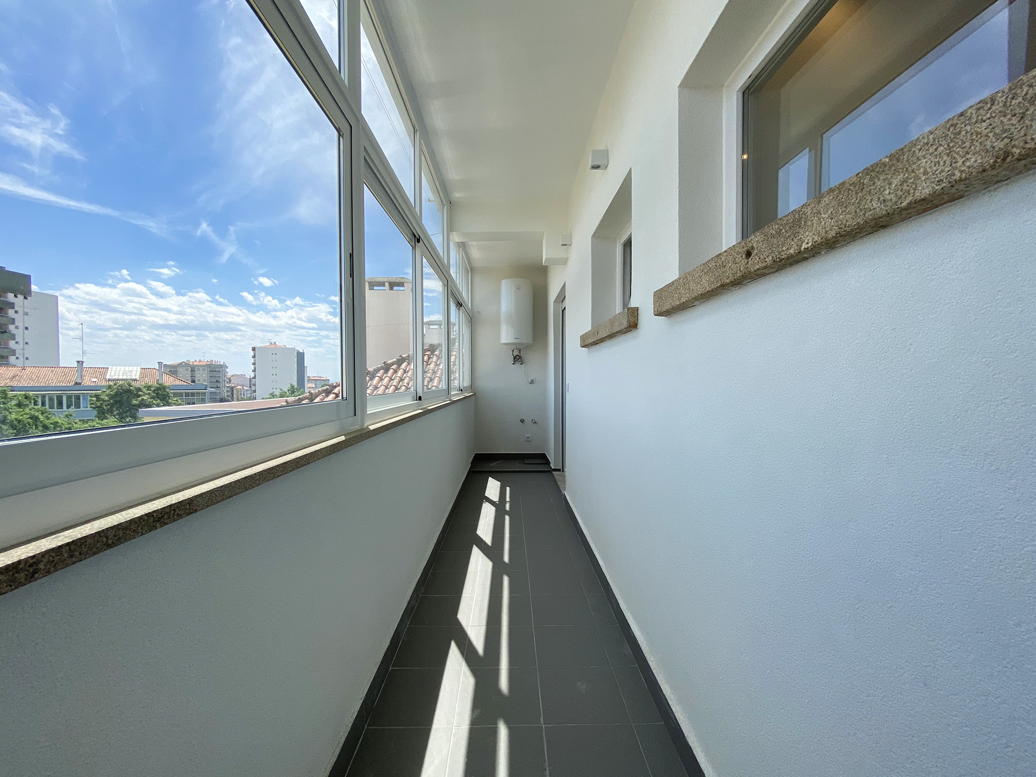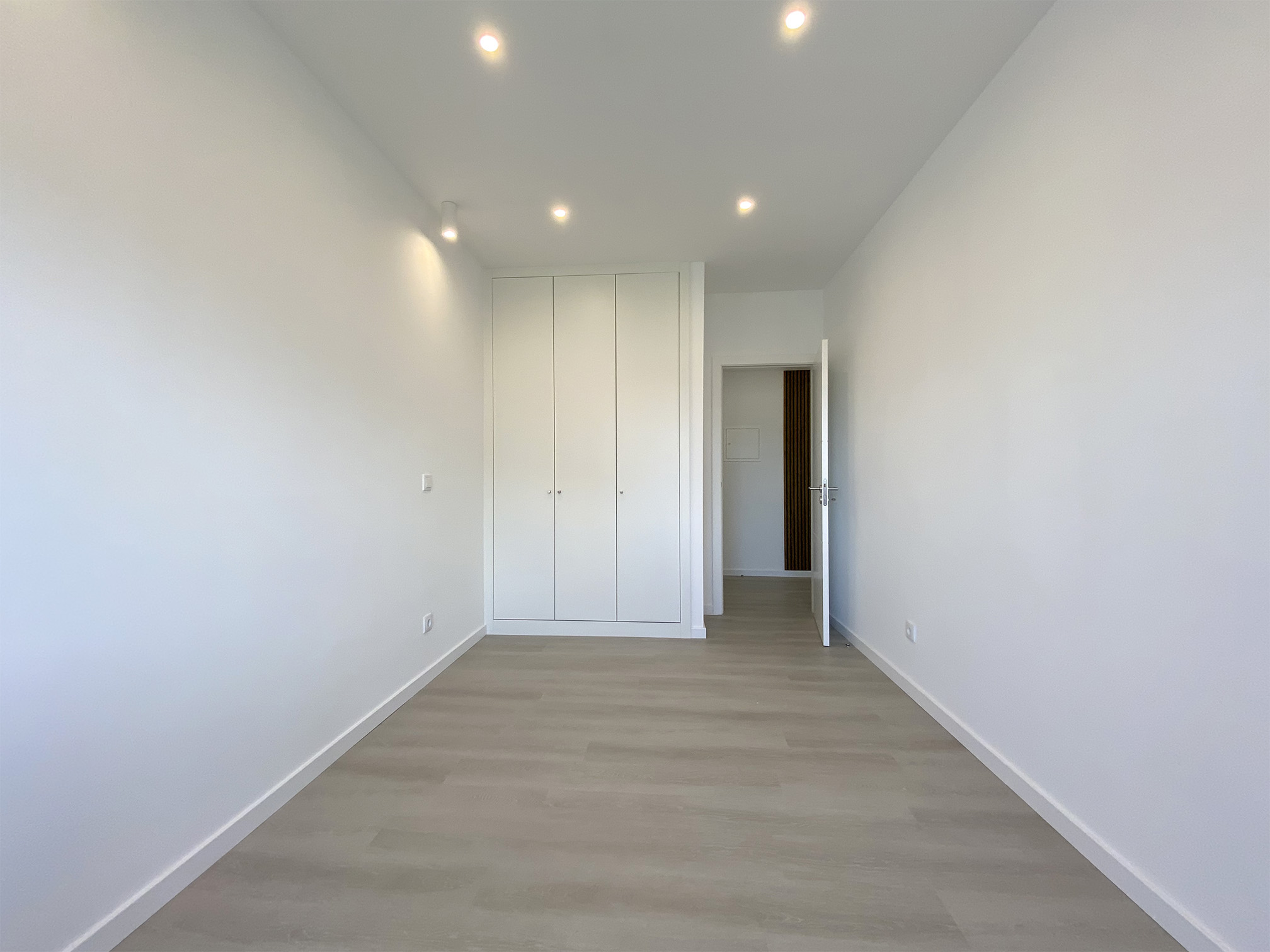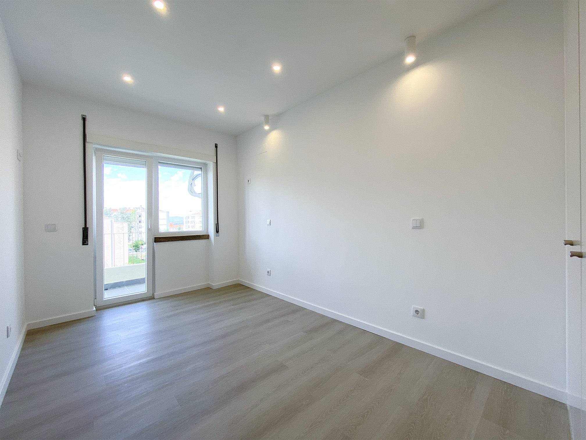 Janelas em PVC com vidro duplo térmico com argon, iluminação LED e teto falso de gesso cartonado.