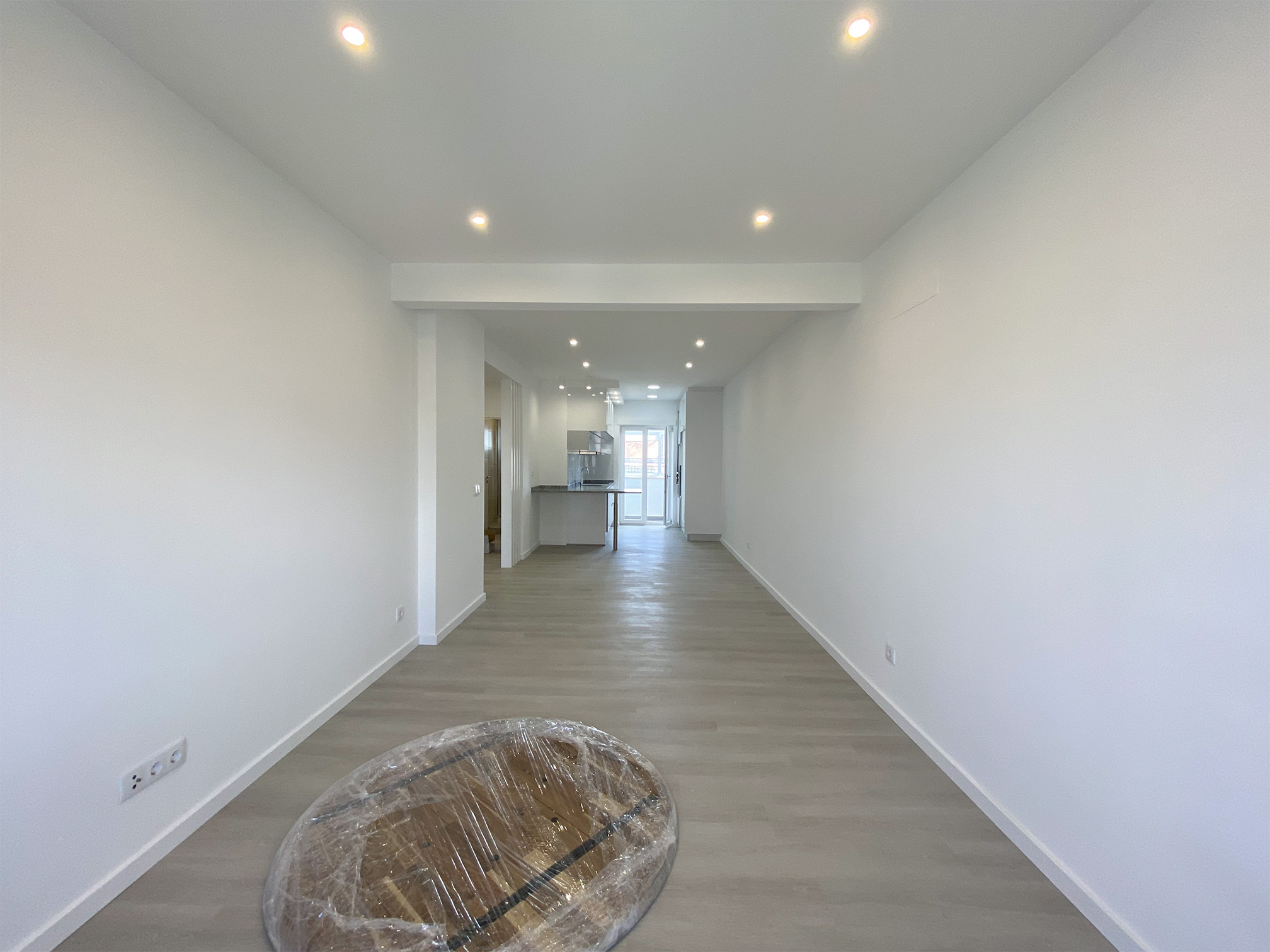 Uma sala em open space com a cozinha, esta em termo laminado e equipada com eletrodomésticos TEKA.
